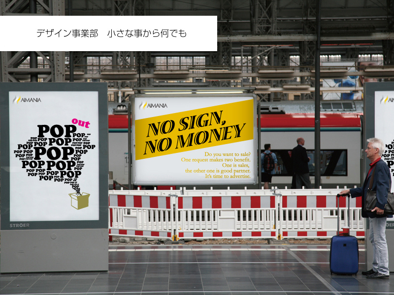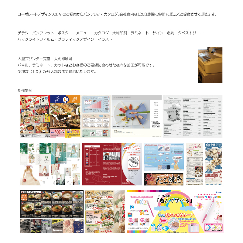 イオンモール、コーナン、ライフなど量販店各特設コーナー(売場案内パネル・商品紹介POP)、飲食チェーン向けメニューポスター、個人店向け開店ツール(看板・メニュータペストリー)